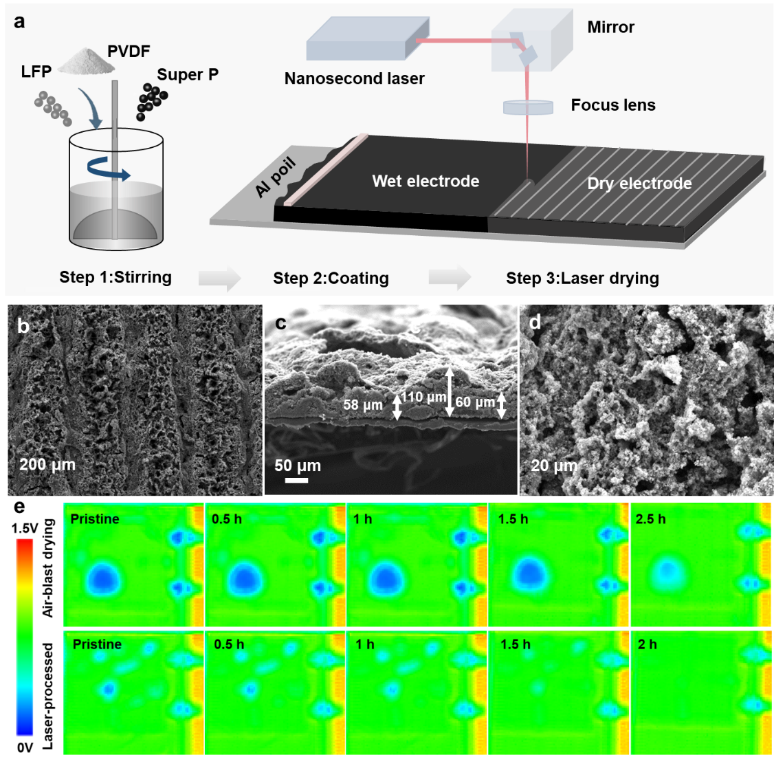 针对上述挑战,曾玉彬教授团队提出了一种基于纳秒脉冲激光技术的原位耦合制造新方法,其核心在于实现了从湿电极到功能化厚电极的“一步式”高效制备。该方法在单一工序内,利用高能激光同步完成了电极的快速稳定干燥与表面微结构的精准构筑,成功诱导形成垂直取向的周期性微沟槽与多级孔隙。由此构建的“宏观通道-微观空腔-纳米孔洞”跨尺度协同传输网络,为离子和电子开辟了双连续的快速通道,从根本上优化了厚电极的离子传输效率、电解质浸润均匀性及机械稳定性,从而显著提升了电极的可逆比容量、快充能力和循环稳定性。该方法将电极制造中两大核心工序合二为一,为高性能锂离子电池的高效制造提供了兼具工艺创新与性能突破的全新解决方案,具有重要的理论意义与工程应用前景。