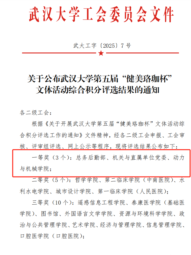 武汉大学第五届“健美珞珈杯”文体活动综合积分评选,威尼斯娱乐城 凭借总积分全校第三的好成绩荣获一等奖。